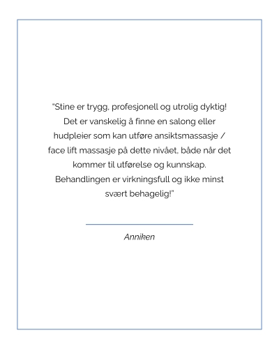 I behandlingene kombinerer jeg inngående kunnskap om hudens fysiologi, ansiktets anatomi og avanserte manuelle teknikker som støtter hudens naturlige spenst og struktur.